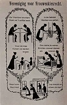The Vereeniging voor Vrouwenkiesrecht (Association for Women's Suffrage) was a women's rights organization active in the Netherlands from 1894 to 1919. It was devoted to women's suffrage. It was the main women's suffrage movement in the Netherlands. The Vereeniging changed its name in 1919 and would fuse with another association in 1930 and again in 1949 and still exists today.