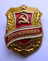 Druzhinas mostly operated in urban neighborhoods. Druzhinniks were distinguished by red armbands with the text "ДНД" or "дружинник" on them.