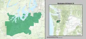 Washington's 10th congressional district is a congressional district in western Washington. The district is centered on the state capital, Olympia, and includes portions of Thurston and Pierce counties (including parts of Tacoma). It was created after the 2010 United States census, which granted Washington an additional congressional seat, bringing the number of seats apportioned to the state up from 9 to 10, and elected Denny Heck as its first member to the United States House of Representatives in the 2012 elections. Marilyn Strickland was elected in 2020 to replace him after he retired to run for Lieutenant Governor.