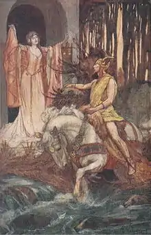 The first branch tells of how Pwyll, prince of Dyfed, exchanges places for a year with Arawn, the ruler of Annwn (the otherworld), defeats Arawn's enemy Hafgan, and on his return encounters Rhiannon, a beautiful maiden whose horse cannot be caught up with. He manages to win her hand at the expense of Gwawl, to whom she is betrothed, and she bears him a son, but the child disappears soon after his birth. Rhiannon is accused of killing him and forced to carry guests on her back as punishment. The child has been taken by a monster, and is rescued by Teyrnon and his wife, who bring him up as their own, calling him Gwri of the Golden hair, until his resemblance to Pwyll becomes apparent. They return him to his real parents, Rhiannon is released from her punishment, and the boy is renamed Pryderi.