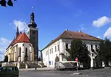 The major sights of the spacious Krále Vladislava Square include a Baroque Marian column (built in 1716–1719), a Baroque town hall from 1717, and the Gothic Church of Saint Catherine with murals from the 15th century. The Renaissance Prague Gate from 1580 is the last preserved of three town gates. There is also a valuable Renaissance Church of Saint George (built in 1613–1616) with a churchyard.[3]
