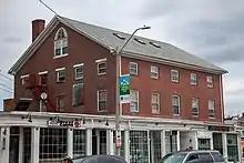 One of the oldest buildings in the district is the Railroad Hotel, also known as the Davis Tavern, built in 1831 by entrepreneur, educator and civic leader Seth Davis, and now serving as a retail and office space.[2] Here, on April 7, 1834, the directors of the Boston and Worcester Railroad and 50 guests, gathered at the Davis Tavern to celebrate their first train journey coming west from Boston. From that time, the train brought suburban commuters to West Newton.