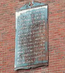 This section of Washington Street was first laid out in the 1690s, alongside John Fuller's 1000-acre farm.[3] The earliest structure still standing is the house of Dr. Samuel Warren (1716) on Cherry Street; originally a block away on Washington Street, the house was built by William Williams, a cousin of the founder of Williams College.[4] The growth of the village continued with the arrival of Congregationalists, and the establishment of the Second Church in Newton in 1764, splitting off from the first Congregational church in Newton Center. An old nickname for West Newton, "Squash End", arose from that period. Soon thereafter the West Parish Burying Ground was established, where graves of some of the early settlers of the village are found; this is one of three early cemeteries in Newton. In 1781, the Second (or West) Parish was officially incorporated.[4]