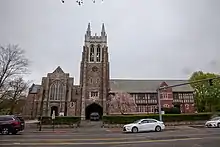 The congregational church, the Second Church of Newton, was originally located on Washington Street, next to the city hall. Then in 1916 construction was completed of a significant Gothic Revival sanctuary with stained glass windows and a tall ornamented spire at 60 Highland Street, just south of the village center.[2] Two other houses of worship, located to the west of the village center, have had important roles in the history of West Newton. The Myrtle Baptist Church at 21 Curve Street has been a center for a thriving African-American community since the 1870s.[8] St. Bernard's Church and Rectory at 1515-29 Washington Street, a Catholic church, is a Newton City Landmark.[5]