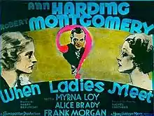 When Ladies Meet is a 1933 American pre-Code comedy film directed by Harry Beaumont and starring Ann Harding, Myrna Loy, Robert Montgomery, Alice Brady, and Frank Morgan. The film is the first adaptation of the 1932 Rachel Crothers play of the same name. It was nominated for an Academy Award for Best Art Direction by Cedric Gibbons.[1]