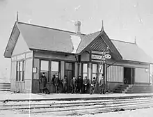 ![]() The Port Perry railway station on the PW&PP, seen looking north some time in 1912. The line leading to Lindsay can be seen running just to the right. The Ross Elevator can be seen in the background, rising over the roof of the station. The station area is now Palmer Park. | |