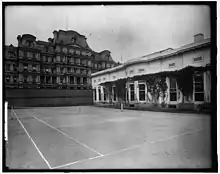 The first tennis court at the White House was built on the south side of the West Wing during the presidency of Theodore Roosevelt, the present location of the West Wing's south terrace. Roosevelt often played here with his son.[1][2] The court became renowned as the haunt of Roosevelt's 'Tennis cabinet', an informal regular gathering of his closet associates.[3] On 1 March 1909 Roosevelt gave a lunch and speech to say farewell to his 'Tennis cabinet'. United Press described the gathering as a "famous coterie of afternoon sportsmen that has been the power "behind the white house" for over seven years". Attendees included people as diverse as the French ambassador Jean Jules Jusserand, the Supreme Court Justice William Henry Moody, soldier Luther "Yellowstone" Kelly, the Oklahoman wolf hunter John Abernathy and Pudge Heffelfinger, the football player.[4]