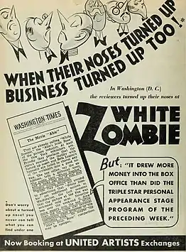 White Zombie premiered on July 28, 1932, in New York City's Rivoli Theatre. The film received a mixed box office reception upon its initial release, but was a great financial success for an independent film at the time.[41][42] In 1933 and 1934, the film experienced positive box-office numbers in small towns in the United States, as well as in Germany under the title Flucht von der Teufelsinsel. White Zombie was one of the few American horror films to be approved by the Nazis.[42] The popularity of the film led Victor Halperin to a contract with Paramount Studios.[29]