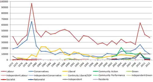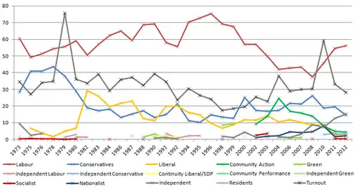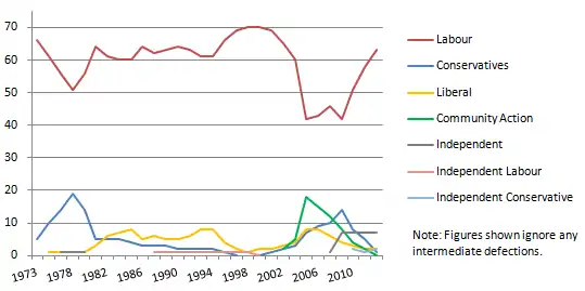 | Year | Labour | Conservative | Liberal Democrats | Community Action | Independent |