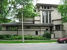 William G. Fricke House is a home by American architect, Frank Lloyd Wright, in Oak Park, Illinois, United States. Fricke commissioned the home in 1901 and it was finished the next year. Wright used elements in the building that would appear in his Prairie style homes: a high water table, horizontal banding, overhanging eaves, shallow hipped roofs, and an exterior with an expansive amount of stucco.[1] Wright usually emphasized the horizontal in his house designs, but the Fricke house is different by having a three-story tower.