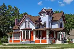 The Watson House is a two-story brick structure, with a dominant square three-story tower on the front facade. The tower is capped by a cross-gabled roof, with large and elaborate paired brackets. Wooden molding encircles the tower, creating a base for the brackets and a hoodmold for the tower windows. The roofline of the house is steep and complex, with intersecting sightlines and corners. Windows come in a variety of window shapes and sizes, and the facade is ornamented with panels, band courses, and piers. The current front porch, constructed in 1920, is a wraparound brick porch with a small projecting portico supported by brick columns. [2]