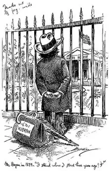 In March 1895, the same month he left Congress, Bryan passed his 35th birthday, making him constitutionally eligible for the presidency.[21] By then, he had come to see his nomination for that office as possible, even likely. Bryan believed he could use the coalition-building techniques he had applied in gaining election to Congress, uniting pro-silver forces behind him to gain the Democratic nomination and the presidency. To that end, it was important that the Populists not nominate a rival silver candidate, and he took pains to cultivate good relations with Populist leaders. Through 1895 and early 1896, Bryan sought to make himself as widely known as an advocate for silver as possible. He had accepted the nominal editorship of the Omaha World-Herald in August 1894. The position involved no day-to-day duties, but allowed him to publish his political commentaries.[22][23] In the 17 months between his departure from Congress and the Democratic National Convention in July 1896, Bryan travelled widely through the South and West, speaking on silver. At every stop, he made contacts that he later cultivated.[24][25] Several times, in his addresses, Bryan repeated variations on lines he had spoken in Congress in December 1894, decrying the gold standard, "I will not help to crucify mankind upon a cross of gold. I will not aid them to press down upon the bleeding brow of labor this crown of thorns."[26]
