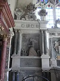 The monument to Katherine Popham (d.1588) stands adjacent to the left (north) of the monument to her husband William Pole (d.1587), and shows her kneeling surrounded by her seven children. Underneath is a tablet with the following inscription in relief: