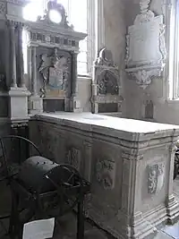Four shields with armorials are displayed on the frieze of the monument supported by two pairs of Corinthian columns, as follows:[11]