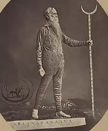 Soon returning to Wales, Price set himself up as a Druid, founding a religious Druidic group that attracted a number of followers. Little is known of the specific doctrines which he preached, but his followers walked around carrying staffs engraved with figures and letters. Declaring that marriage was wrong as it enslaved women, he began having a relationship with a woman named Ann Morgan, whom he moved in with, and in 1842 they had a daughter. He baptised this child himself at the Rocking Stone in Pontypridd, naming her Gwenhiolan Iarlles Morganwg (meaning 'Gwenhiolan, Countess of Glamorgan').[26] He began developing an appearance that was unconventional at the time, for instance wearing a fox fur hat (signifying his healing powers as a doctor) and emerald green clothing, as well as growing his beard long and not cutting his hair. He also began attempting to hold Druidic events, organising an eisteddfod at Pontypridd in 1844, but nobody turned up, and so, solitarily, he initiated his daughter as a bard at the event. In 1855 he then led a parade of the Ivorites, a friendly society that held to a philosophy of Welsh nationalism, through the streets of Merthyr Tydfil, accompanied by a half-naked man calling himself Myrddin (the Welsh name for Merlin) and a goat.[27]