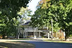 The principal surviving elements of the estate complex are its main house, gatehouse/caretaker's cottage, two barns, an ice house, and a hen house. The main house is a large three-story wood-frame building, with a hip roof and clapboarded exterior. The building has massing that is Colonial Revival, and includes decorative features from Queen Anne and Shingle styles. When built, the house had all of the modern amenities of the time, include gas lighting. Fresh water was supplied from a water tank in the attic of the cow barn, which was supplied from the lake by a steam-powered pump.[2]