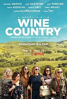 Wine Country is a 2019 American comedy film co-produced and directed by Amy Poehler (in her feature directorial debut) from a screenplay written by Emily Spivey and Liz Cackowski, based on a story conceived by Poehler, Spivey, and Cackowski. Starring Poehler, Maya Rudolph, Rachel Dratch, Ana Gasteyer, Paula Pell, Spivey, Jason Schwartzman, and Tina Fey, the film follows a group of long time friends who take a vacation to Napa Valley as a birthday getaway. The film was released in select theaters on May 8, 2019, and digitally released for streaming on May 10, 2019, by Netflix.[1]