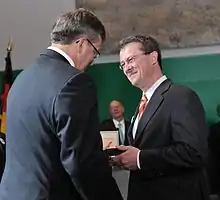 On 3 September 2010, the Polish state president Bronislaw Komorowski awarded him with the Medal of the European Centre of Solidarity in the German Reichstag parliament building in Berlin in the presence of the Bundestag's president Norbert Lammert. He received the medal for organizing the support of Solidarity activist's families and supplying the Solidarity underground with, inter alia, printing presses and "smuggling" of current literature from Germany to Poland, as well as political, dissident literature from Poland to Germany.[29][30][31]