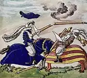 Maximilian shared Polheim's enthusiasm.[22] He evidently admired Polheim's jousting skills, and ensured that he played an important part in Maximilian's tournaments.[20] Maximilian was himself a frequent participant in tournaments[22] and Polheim is known to have jousted with Maximilian on several occasions. One contemporary source identifies 15 instances when Maximilian and Polheim jousted against each other. Many of these jousts were embellished with exuberant features. At a tournament in Ghent, they were described as jousting "in 'exploding' armour [and] painted horse armour".[note 2] At another tournament, staged in the ducal menagerie in Brussels, Polheim jousted with a basket of eggs resting on his helmet and Maximilian wore a chained frog as a crest.[25]