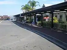 Modern platform canopies with steel posts on concrete bases and corrugated steel skillion roofs connecting the platform buildings to the lifts.[3]