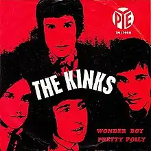 In the last week of March 1968, Ray selected "Wonderboy" from the Kinks' backlog of recorded material to be the band's next single.[13][lower-alpha 2] Pye rush released the single in the UK on 5 April 1968 with "Polly" as its B-side.[13] Prominent advertisements in all British weekly magazines accompanied the release,[13] but the song was the band's worst performing British single since "You Still Want Me" in early 1964.[14] The single's highest British chart appearance was in New Musical Express, where it appeared for one week at No. 28.[15] It reached No. 36 on Record Retailer's chart,[16] and it did not appear on Melody Maker's chart.[13] The failure ended the band's streak of twelve consecutive top 20 hits, the last five of which had made it to the top five.[15] The single sold 26,000 copies,[13] roughly one-ninth of each of the band's two UK singles from the previous year, "Waterloo Sunset" and "Autumn Almanac".[15][lower-alpha 3]
