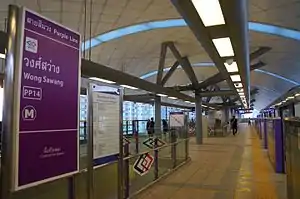Wong Sawang station (Thai: สถานีวงศ์สว่าง, pronounced [sā.tʰǎː.nīː wōŋ sā.wàːŋ]) is a Bangkok MRT station on the Purple Line. The station opened on 6 August 2016 and is located on Bangkok-Nonthaburi road, near its intersection with Wong Sawang Road in Bangkok.[1] The station has four entrances.[2] This is the last station on the Purple Line located in Bangkok Province before the line continues north into Nonthaburi Province.
