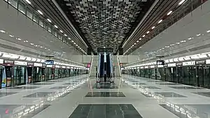 The station's interior has a red and white scheme that was inspired by the National Flag of Singapore, to welcome visitors coming from Malaysia into the country. The station also features aluminium ceiling panels above the platforms which mimic the movements of the daily flux of commuters.[30] The station has a much larger size compared to other MRT stations, as the station was set to accommodate the peak-hour traffic for travellers between Singapore and Johor Bahru.[31] There are two exits from the station.[32]