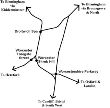 | Worcester Shrub Hill | Great Western Railway Hereford – London Paddington |