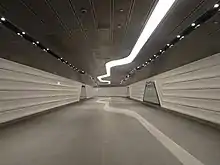 The Wynyard Walk is a 180-metre-long (590 ft) pedestrian link and tunnel between Wynyard station and Barangaroo that opened in September 2016,[11] with a Clarence Street entrance that opened in December 2016. Based on a design by architecture firm Woods Bagot,[12] the project combined a new entrance, a pedestrian tunnel, a pedestrian bridge, and a new pedestrian plaza. Wynyard Walk provides direct access via tunnels to Clarence, Kent and Sussex streets.[13][14] Wynyard Walk features a huge video screen showcasing digital art.[15]
