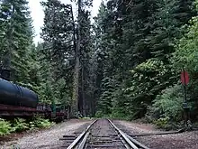 The current railroad follows a portion of grade originally carved into the mountain by the Madera Sugar Pine Lumber Company in the early 20th century. The company originated in 1874, when it was organized as the California Lumber Company to log the area surrounding Oakhurst, California.[3] The Madera Sugar Pine Lumber Company once had a large sawmill at Sugar Pine, California, just south of the current YMSPRR.[4] The railroad had seven locomotives, over 100 log cars, and 140 miles (230 km) of track in the surrounding mountains.[5] In addition to the railroad, the Company also transported lumber in a flume that stretched 54 miles (87 km) from Sugar Pine to Madera, California.[6] This was the most efficient way to transport rough cut lumber out of the mountains for finishing and transport at the bottom of the mountain. The Madera Sugar Pine Lumber Company practiced clearcutting, which removed almost every single tree within the stands of timber surrounding the YMSPRR track. The thick forest surrounding YMSPRR today belies this history, although large stumps from the original old growth timber dot the forest floor lining the tracks.