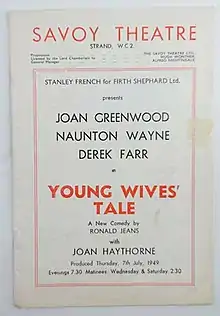 Young Wives' Tale is a 1949 comedy play by the British writer Ronald Jeans. It premiered at the Theatre Royal, Brighton before transferring to the Savoy Theatre in London's West End where it ran for 373 performances between 7 July 1949 and 27 May 1950. The original London cast included Naunton Wayne, Joan Greenwood, Derek Farr, Joan Haythorne and Margaret Scudamore.[1]
