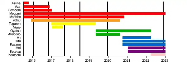 | Yotsu Hitomi (一十三四) | Green | Joined August 2015, Left August 2020 |