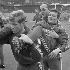 Čebinac carried by 1. FC Nürnberg teammate Fritz Popp and head coach Max Merkel during training in 1968